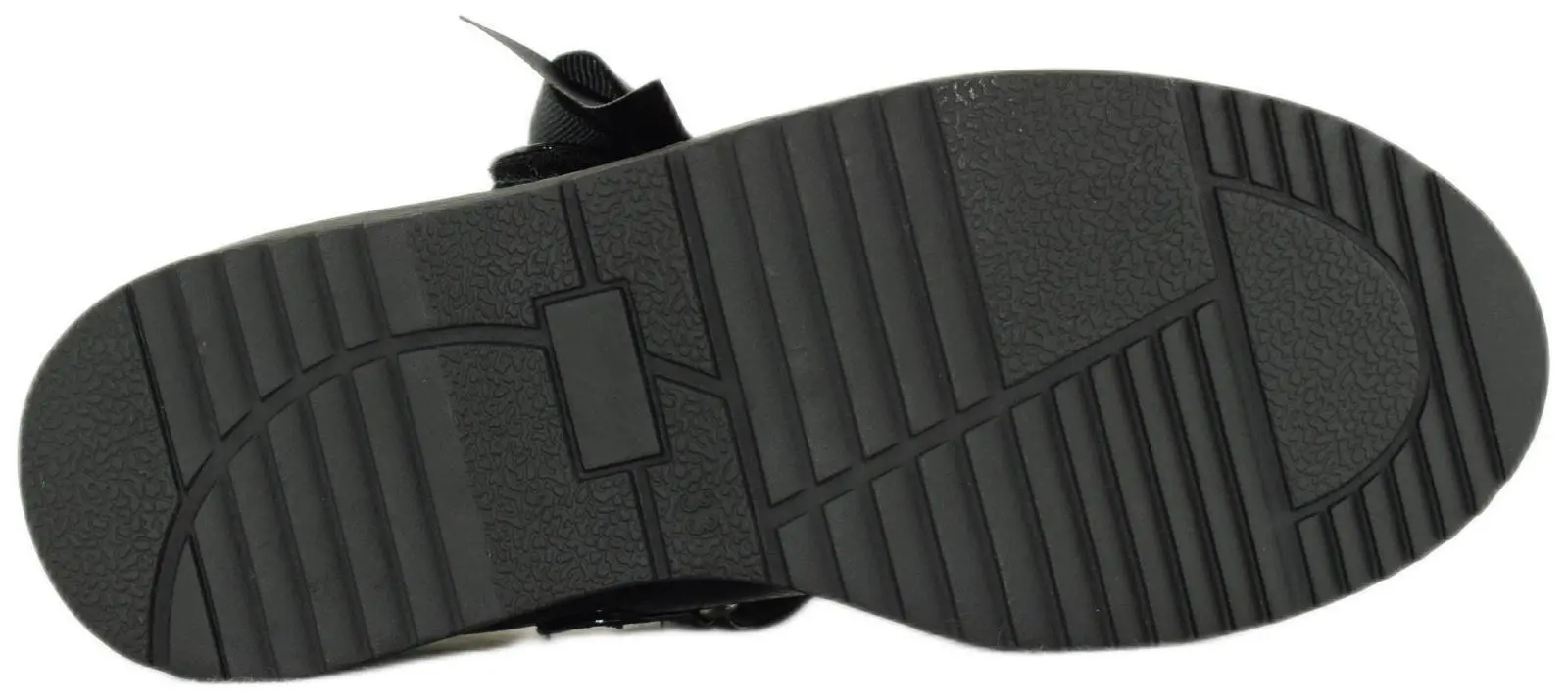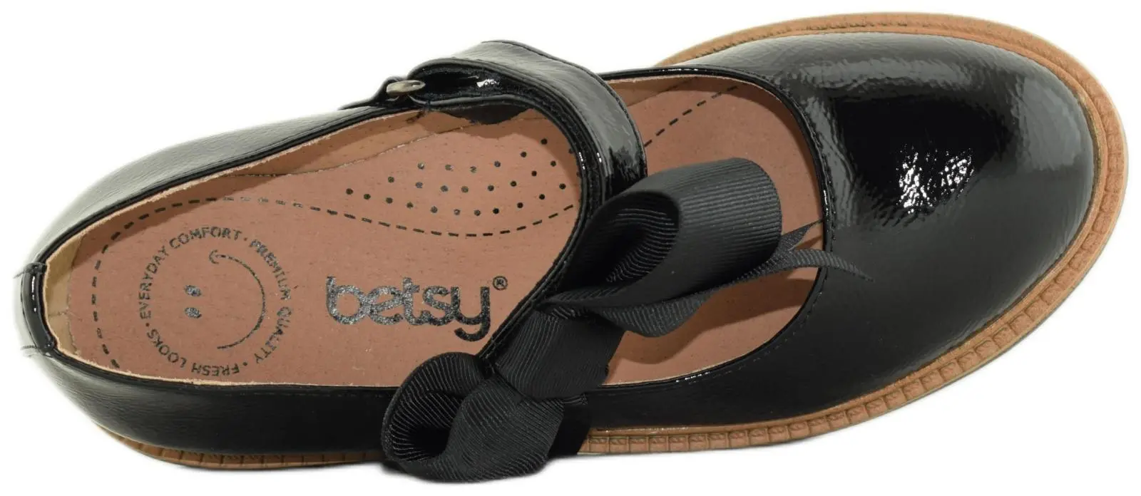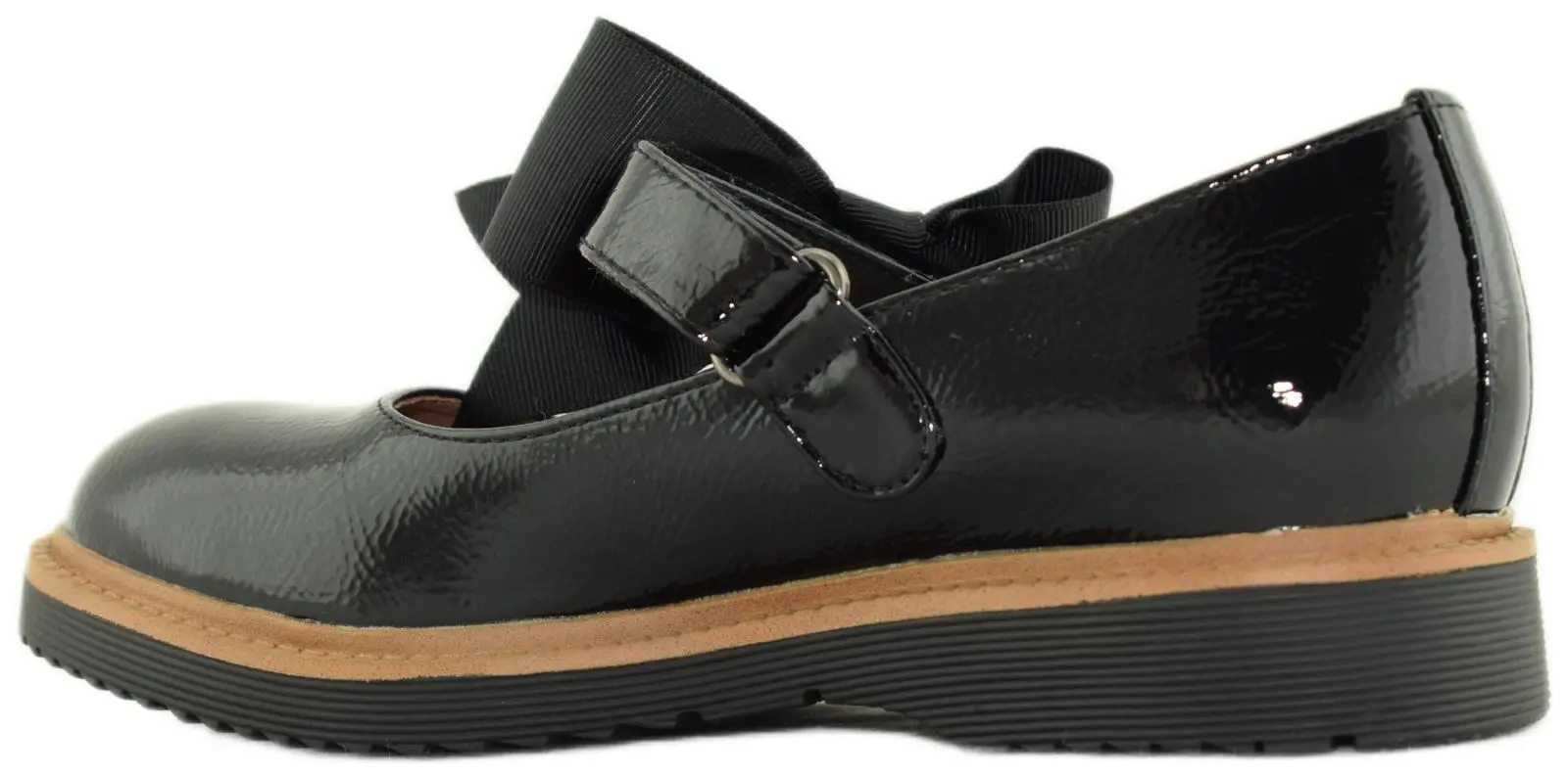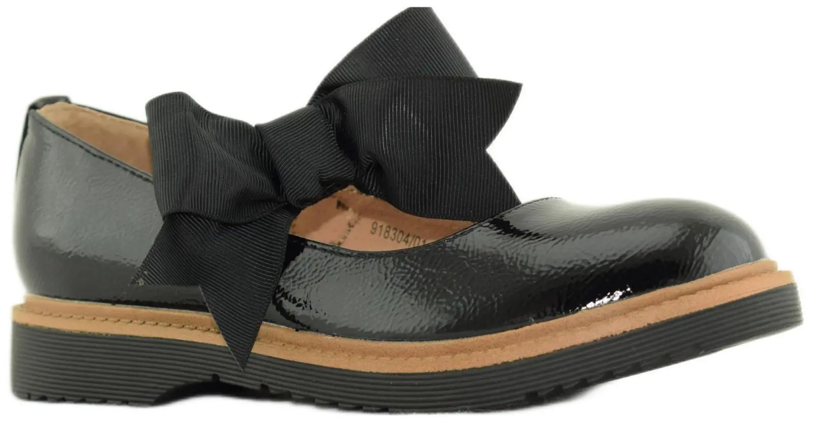 Удобные лакированные туфли с изогнутой колодкой выполнены из высокотехнологичной черной экокожи и украшены эластичным ремешком на подъеме. Модель с закругленным мыском и черной подошвой с коричневой окантовкой дополнена объемным бантом.