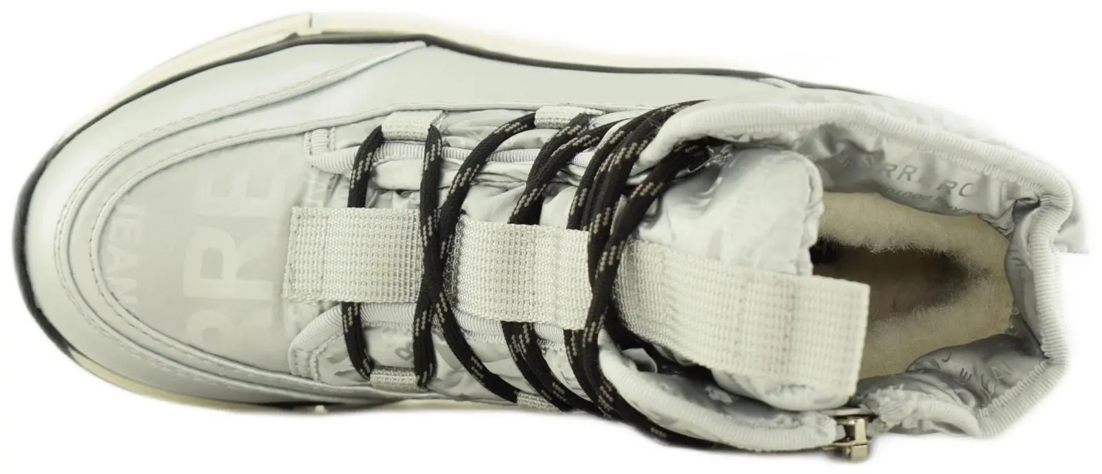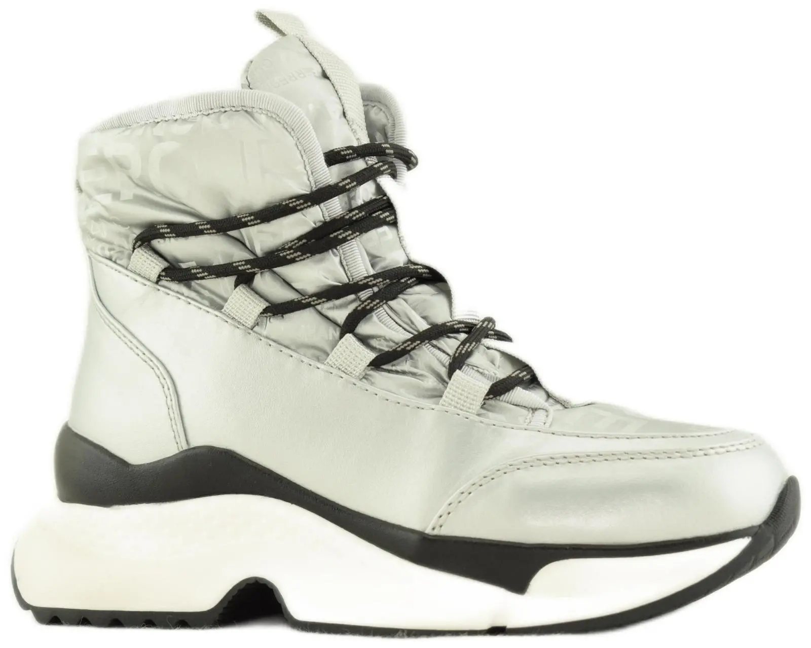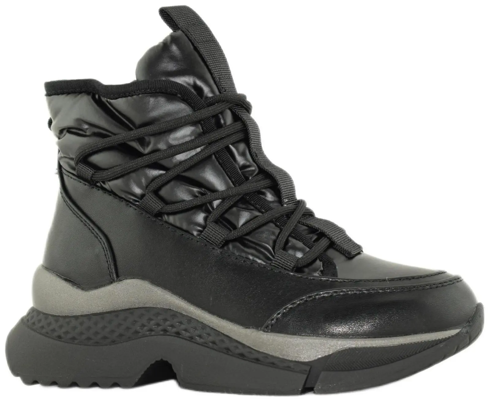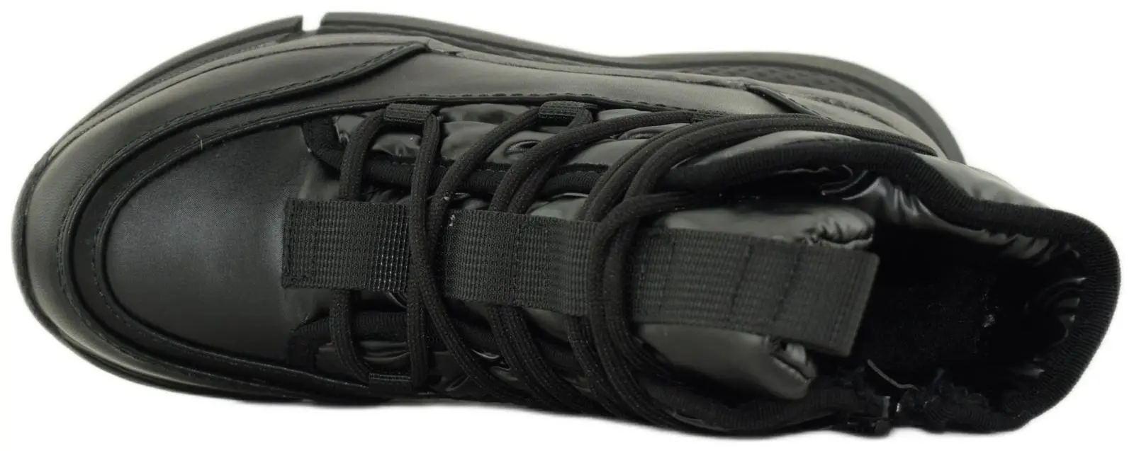 Зимние дутики в спортивном стиле выполнены из черного нейлона. Модель с вставками из высокотехнологичной экокожи дополнена шерстяной подкладкой, широкой объемной шнуровкой, завязывающейся вокруг щиколотки, и нескользящей морозостойкой подошвой. Петля на язычке и потайная молния сбоку позволяют быстро обуваться.
