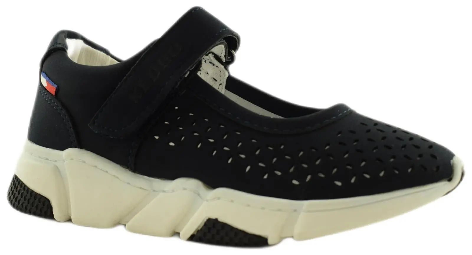 В практичных школьных туфлях с перфорацией вы будете чувствовать себя комфортно на протяжении всего дня. Модель с укрепленным мыском и пяткой выполнена из синего высокотехнологичного эконубука. Эластичный ремешок на подъеме надежно фиксирует ногу. Высокая белая платформа завершает образ.