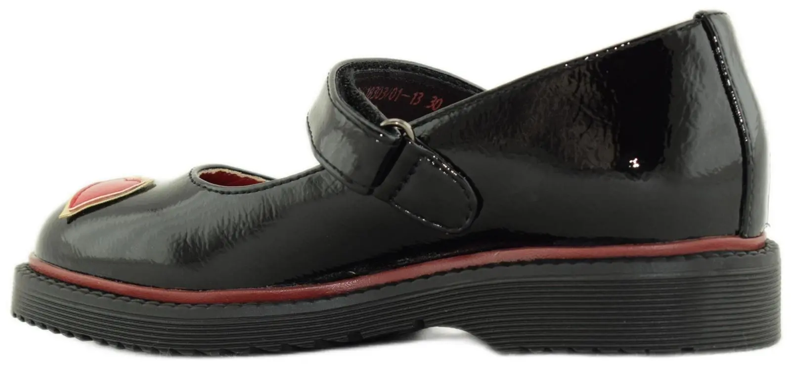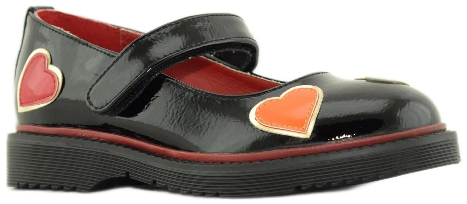 Оригинальные туфли с ярким декором с сердечками понравятся тем, кто любит эксперименты! Модель с закругленным мыском выполнена из высокотехнологичной черной экокожи на подкладке из натуральной кожи красного оттенка. Легкая черная подошва с красной окантовкой и небольшим физиологичным каблуком завершает образ.
